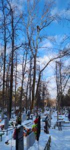 Помимо этого, убираем аварийные деревья на кладбищах. Эта работа еще сложнее: на технике сюда не заедешь. Нанимаем специалистов (арбористов). Спациалисты залазят на каждое дерево и вручную спиливают. Все делаем аккуратно, чтобы не повредить могилы и памятники. За декабрь-январь убрали 24 дерева на Сысертском кладбище, 13 – на Октябрьском, 14 – на Бобровском.