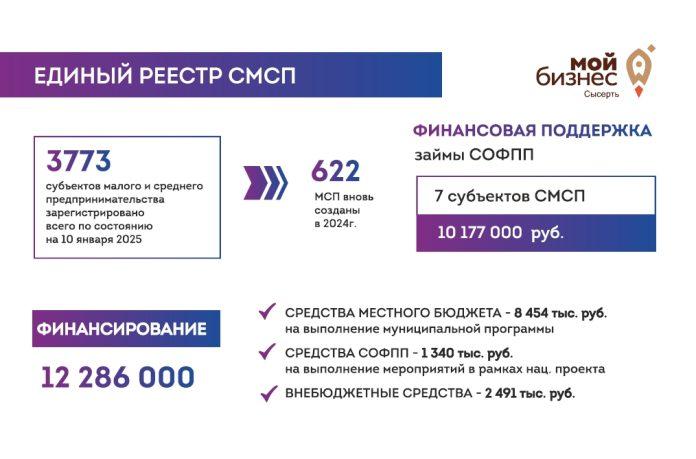 По состоянию на 10 января 2025 года в Сысертском муниципальном округе зарегистрировано 3773 субъектов малого и среднего предпринимательства. 622 появились в течение 2024 года.
