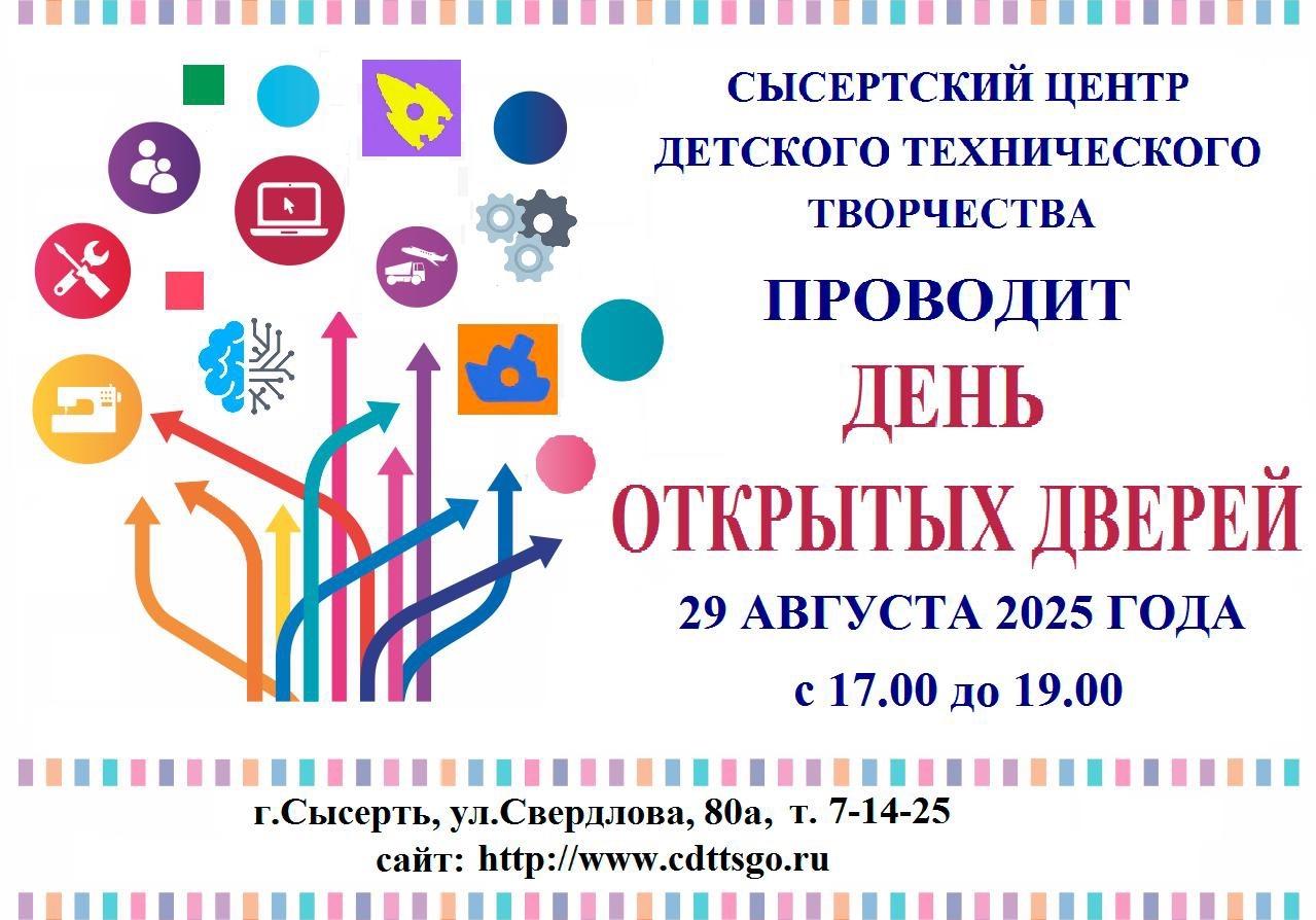 29 августа с 17 до 19 часов ЦДТТ (центр детского технического творчества) проводит день открытых дверей. Чтобы родители и дети смогли познакомиться, в каких кружках и чем можно заниматься во внешкольное время. Место проведения: Сысерть, ул. Свердлова, 80-а (возле школы имени Бажова).