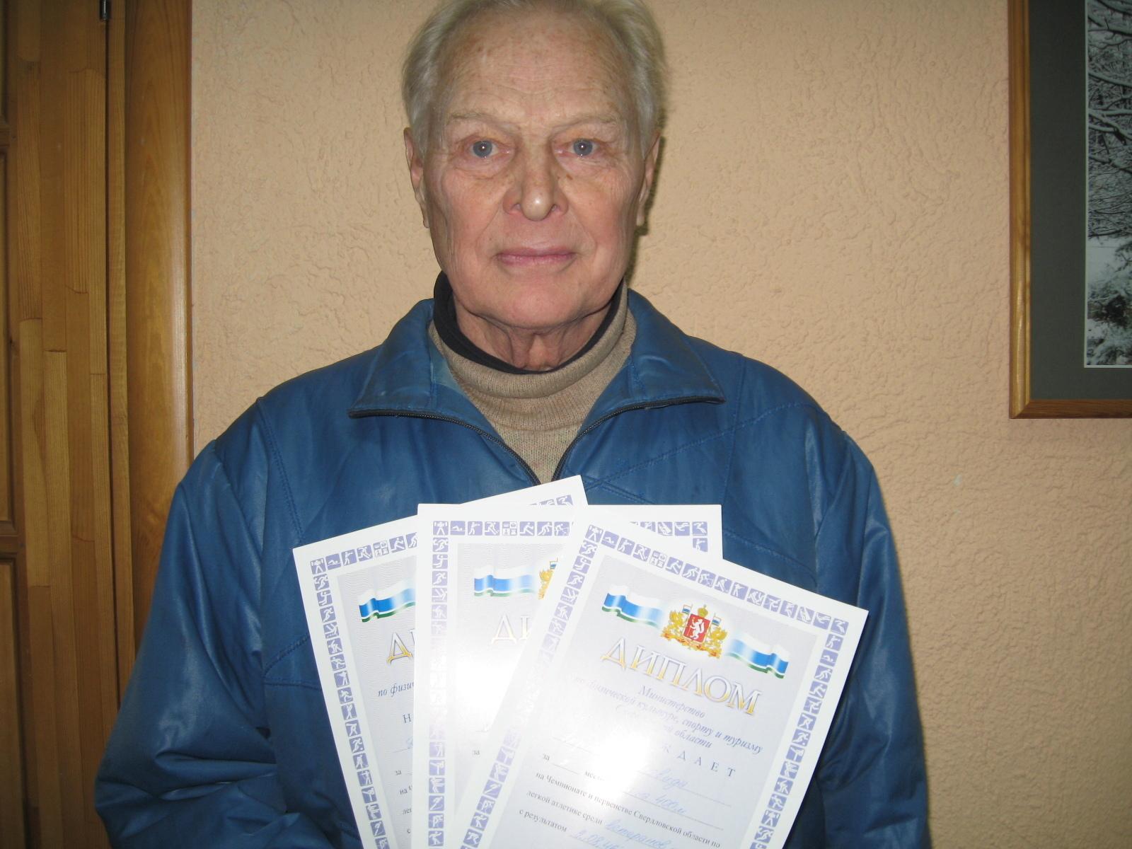 В трех видах из них: в беге на 60 метров (результат: 14 мин. 19 сек.), 200 м. (результат: 52 мин. 3 сек.) и 400 м. (2 мин. 13 сек.) хорошо выступил 77-летний сысертчанин Давид Дерябин, ставший серебряным призером на этих дистанциях в возрастной группе 75-80 лет. А победил в забеге его давний друг и соперник из Екатеринбурга Юрий Зайцев.