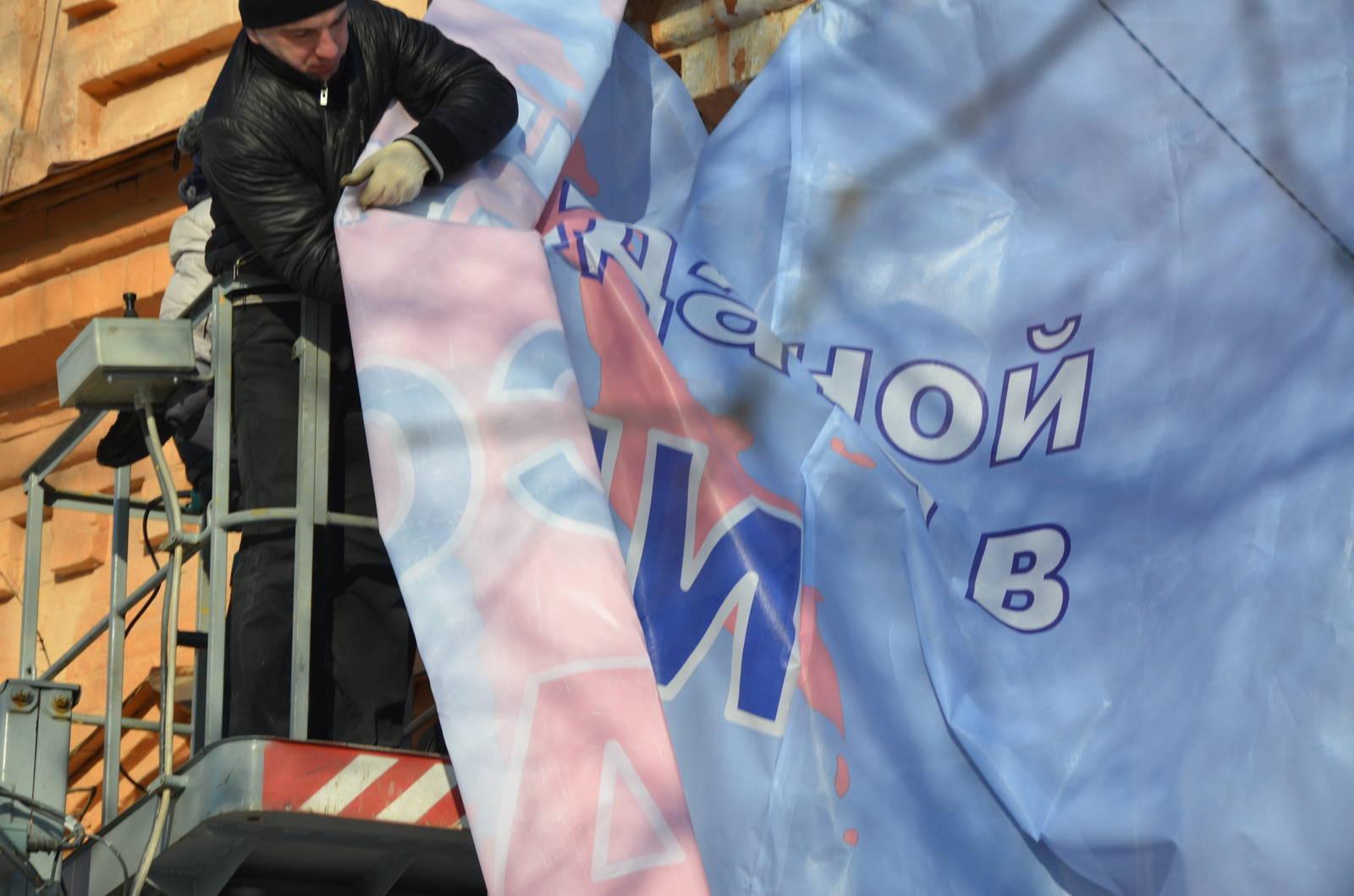 Уже к половине третьего милицией были составлены административные протоколы на лиц, занимавшихся размещением незаконной агитации. Баннер пока еще висит, но его обещают снять.