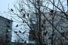 Недавно на крышах многоэтажных домов по ул. К. Маркса расположилась огромная стая птиц. Шумно и быстро эти птички буквально за полчаса съели почти все ягоды с молодых рябин во дворе дома №59. Мы успели сделать пару снимков с этого нашествия. Как оказалось, это – свиристели, красивые певчие и перелетные птицы.