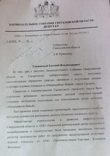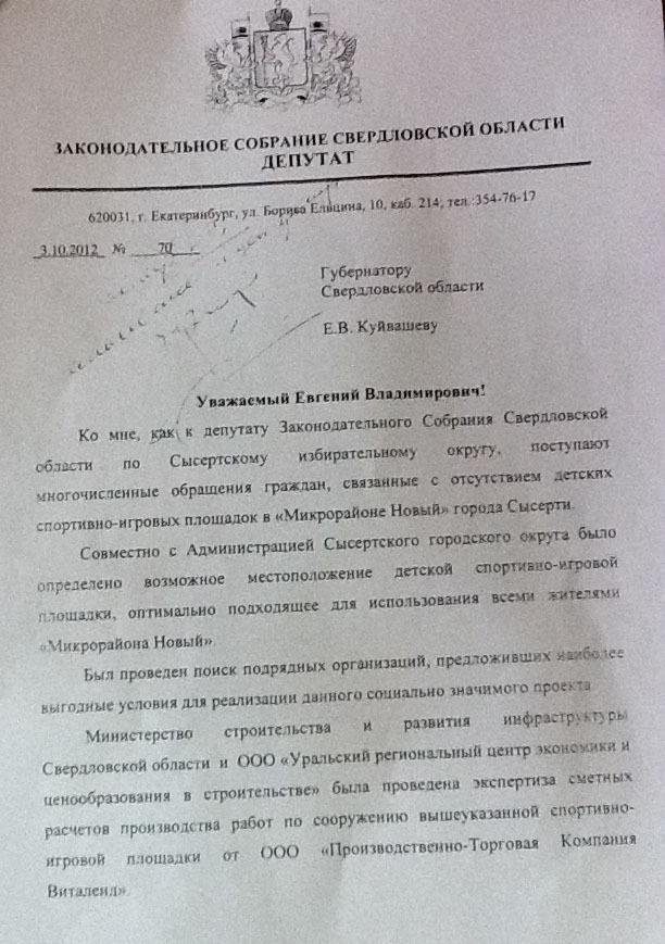 08 октября 2012 г. объем финансирования строительства детской площадки в мкр. Новый, 23 согласно сметной стоимости был согласован с Губернатором Свердловской области Куйвашевым Е.В., которым было дано поручение Председателю правительства Паслеру Д.В. о выделении средств.