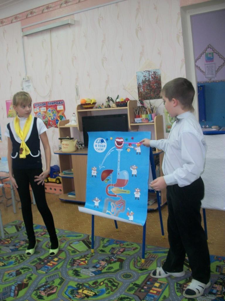 Игровые встречи в детских садах посёлка вели четвероклассники – члены детской организации «Солнечная страна». Яна Пшикова и Никита Одношевин знакомили дошкольников с основами здорового питания. Нужную информацию о вредных и полезных продуктах дети узнали от Егора Кашина и Влада Смелова. Ульяна Воронова, Лиза Месилова, Оля Гудилина рассказали о режиме и гигиене питания: