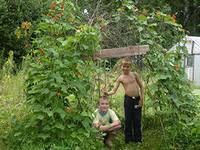 На отведенном для этого месте установите жерди в виде пирамиды, внутри которой может спокойно разместиться со своими игрушками ваш ребенок или ваши дети. Между жердями параллельно земле натяните в несколько рядов веревки. Можно (это будет еще лучше) вместо веревки воспользоваться мелкоячеистой пластиковой сеткой (они есть сегодня практически во всех специализированных магазинах). Эта сетка, во-первых, даст ощущение закрытого пространства, и пока фасоль еще не выросла. Во-вторых, вьющейся фасоли будет на что опираться, а в третьих, растение с плодами не будет потом проваливаться с верху в шалаш и мешать ребенку.
