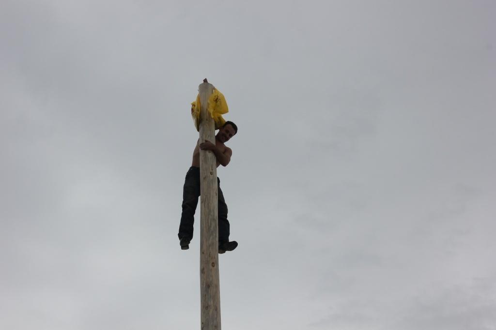 Конечно же, кульминацией праздника стала культурная программа с конкурсами и молодецкими забавами. Так, 12 молодцев попытались забраться на 12-метровый столб. Троим из них это удалось. Поднявшись на самый верх, они вытянули себе бумажки с названием призов. Так счастливчики унесли с праздника телевизор, электропечь и электромясорубку.