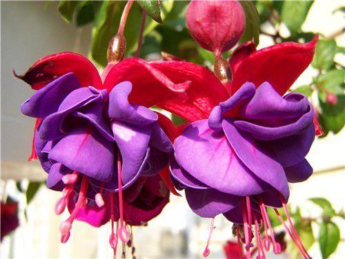 Цветы у фуксии бывают простыми, полумахровыми, махровыми и кистевидными, разной величины и оригинальной формы. Соцветия фуксии имеют самую разнохарактерную окраску. Чашечка цветка – белая, светло-красная, красная, темно-красная. Венчик – розовый, белый, красный, голубой, фиолетовый, синий, темно-бордовый.