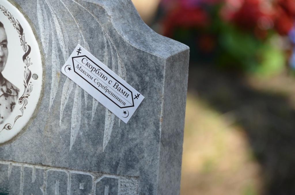 DSC_2666Придя на кладбище в Родительский день вы можете обнаружить на памятниках родных приклеенные размером 4х10 сантиметров бумажки с текстом: «Скорблю с Вами. Максим Серебренников».