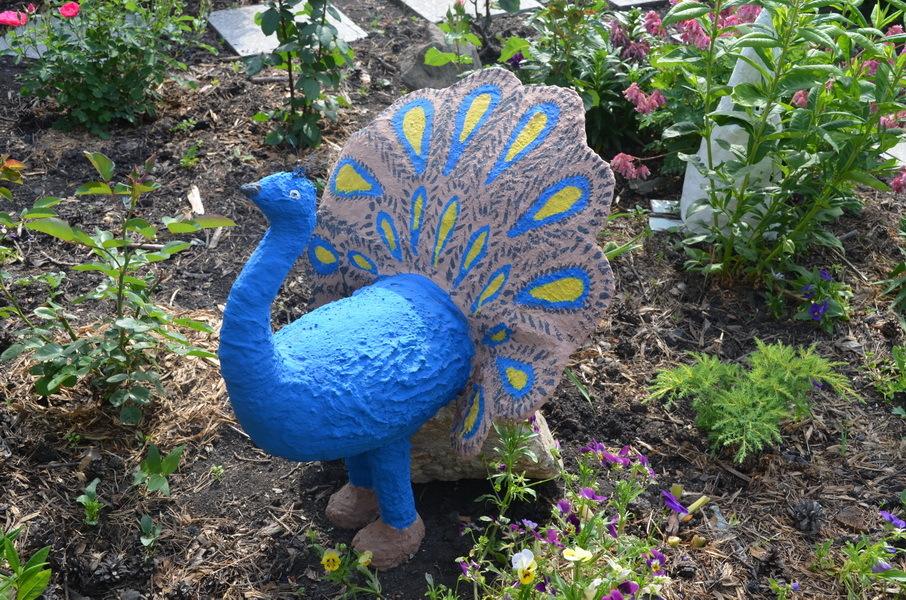 Когда у Южаниновых появилась внучка Василина, Ирина Ивановна уволилась с работы, чтобы сидеть с ней. Играя и занимаясь, они сначала лепили из пластилина, потом делали фигурки из папье-маше… Маленькие, побольше и совсем большие. Так в саду и поселились игрушки, сделанные своими руками. Первыми появились лебеди, потом – слон, павлин… Чтобы игрушки стали более долговечными, сверху покрывали их шпаклевкой, а потом и цемент с алебастром стали использовать. Именно так сделаны дракон и Змей-Горыныч… За лето игрушки выгорают и каждую весну бабушка с внучкой красят их заново. Цвет выбирает Василина. Именно поэтому не только павлин, но и слон – насыщенно синие. Кстати, внутренность этого слона – бочонок из-под пива, через который пропущен шланг. Так что хобот слона стал фонтаном.