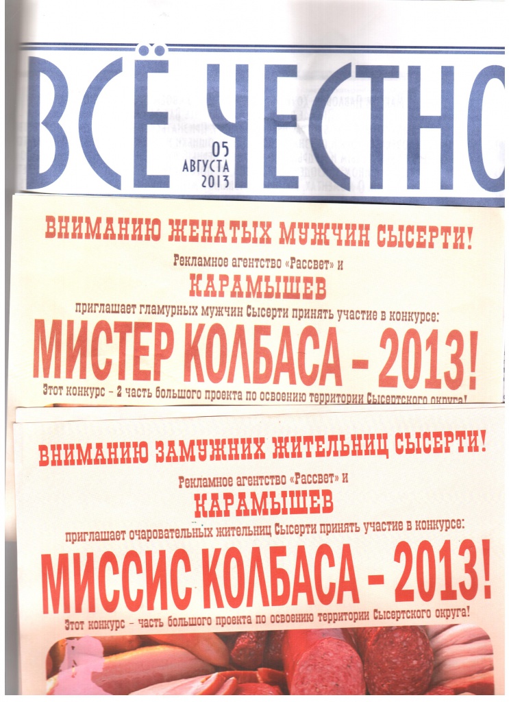 Впереди еще месяц избирательной кампании, а нас уже завалили черной агитацией. Во вторник в почтовые ящики, а также на стоящие машины крепили листовки «Мистер колбаса-2013» и «Миссис колбаса-2013». Эти листовки без выходных данных можно было увидеть и просто валяющиеся на улицах. В этих листовках черный пиар в отношении кандидата А. Г. Карамышева опустился ниже пояса.