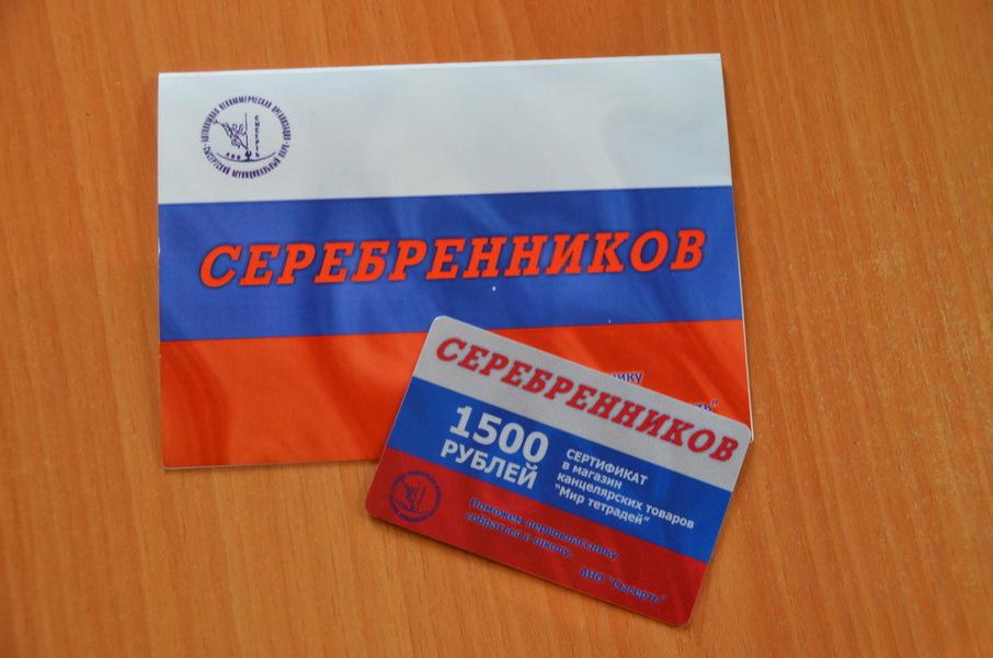 СертификатРодителей первоклашек пытаются очаровать за 1500 рублей. Сертификат  «Серебренников 1500 рублей» в магазин канцелярских товаров «Мир тетрадей».