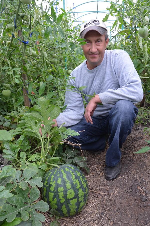 – Выписал газету «Комсомольская правда», – продолжает он. – А там рядом с публикациями о саде-огороде пакетики с семенами приклеены. Семена укропа, капусты и арбуза приходили. В последнем оказалось всего три семечка. В марте посадил их в горшочки, после – высадил рассаду в теплицу с томатами. Плодов завязывалось много, но почти все потом пропадали. А вот один растет и растет. Подкармливаем, как и другие культуры, только золой. Баню топим, а золу – сразу в грядки.