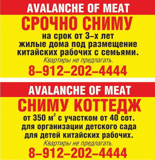 КитайцыВ начале в “Маяке” и других сысертских газетах появились необычные объявления: “Срочно сниму на срок от трех лет жилые дома под размещение китайских рабочих с семьями. Квартиры не предлагать. Сниму коттедж от 350 кв м с участком от 40 соток для организации детского сада для детей китайских рабочих.” Английская надпись – какая-то абракадабра со словом “мясо”. Аналогичные рекламные щиты появились и на трассе, ведущей из Сысерти в Екатеринбург. С разбега и не догадаешься, что это объявление связано ни с чем иным, как с выборами главы Сысертского городского округа, которые состоятся 8 сентября.