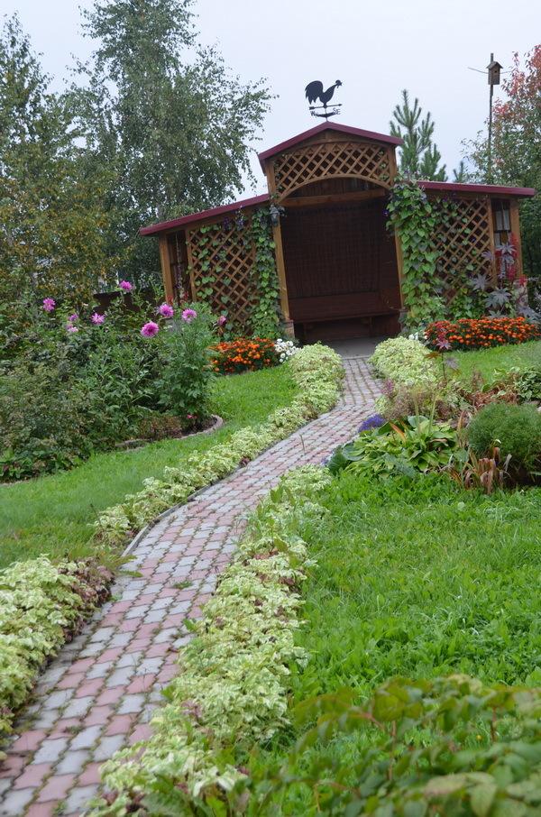 Планировку участка помог сделать знакомый дизайнер. А большинство растений были перевезены из сада и посажены здесь в первый же год. Но, конечно, многое и докупалось. После стали потихоньку сооружать клумбы, горку, пруд (все это – работа Леонида Александровича), высаживать дополнительные растения для образования изгороди вдоль забора. Эта изгородь состоит из самых разных деревьев и кустарников, среди которых очень красивая декоративная яблонька, березка, рябина, ирга, черемуха, сосна…