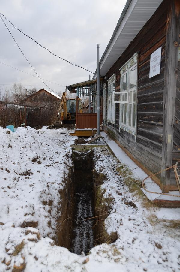 Сейчас в детском саду идут ремонтные работы. Из выгребов все выкачали, их засыпали землей. В туалетных комнатах разобрали полы будут заливные. Вдоль здания тянется траншея, будут проложены водопровод и канализация, чтобы поставить унитазы, раковины для умывания. В группах ободрали обои… Где-то подштукатурят, везде побелят, покрасят, ленолеум поменяют на полу… Глава округа А. Г. Карамышев перед М. А. Серковым и директором Сысертского ЖКХ В. Ю. Никитенко поставил задачу: к 1 декабря открыть.