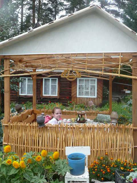 Конечно, в саду тесновато и, чтобы случайно не наступить на какое-то пробивающееся из почвы растение, увлекающаяся цветами Аня попросила деда сплести из ивы небольшие решетки. Так несколько лет назад у Геннадия Петровича появилось новое увлечение. Он не только секции для заборчиков плетет, но и корзины. Делает это, в основном, зимой, когда в саду другой работы нет. Все, что сплел, обрабатывает лаком для лучшей сохранности, без этого плетни быстро почернеют и гнить начнут. На зиму свои изделия убирает. В прошлом году Геннадий Петрович сделал беседку, в которой плетение – главное украшение. Здесь не только стены, но и люстра плетеная. Выглядит беседка очень необычно и, конечно, всем нравится. Вот такой у них сад – не только для работы, но и для душевного отдыха.