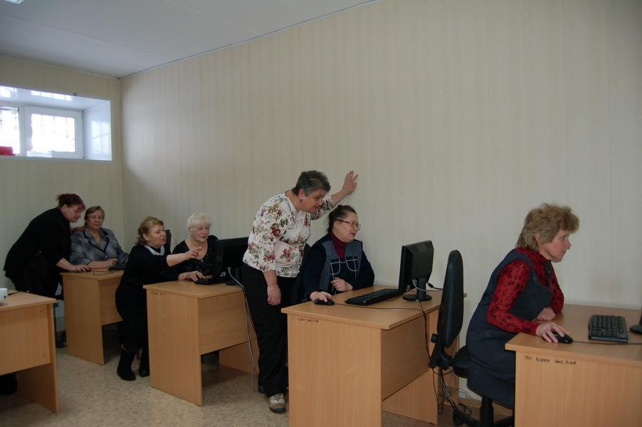 Компьютерные курсы ведет инженер-программист – Светлана Владимировна Котова. Раз в неделю, по вторникам, прибывают на занятия пенсионеры. Поток делится на несколько групп. Каждая группа занимается по два часа. Обучение длится 3-4 месяца. Начинают с самого простого: как устроен компьютер, как его включать, как пользоваться клавиатурой. Осваивают ворд, обзорно получают знания об экселе и паур пойнте, после чего начинается самое интересное – интернет.