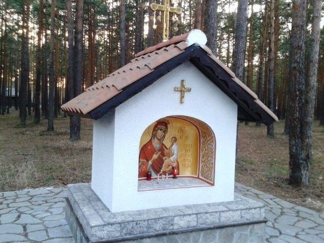 Интересный религиозный объект можно обнаружить, отправившись на прогулку по лесу в районе детской турбазы “Серебряное копытце”. Икона Божьей Матери с Иисусом на руках, установленная на каменном постаменте и покрытая черепицей. Место для молитвы среди сосен обустроили жители одного из близлежащих домов по переулку Фарфоровый. Подойти к иконе может любой желающий, здесь даже проложен мостик через канаву. В Пасху здесь, по-видимому, побывали местные верующие. В углублении можно было обнаружить свечи и пасхальные яйца.