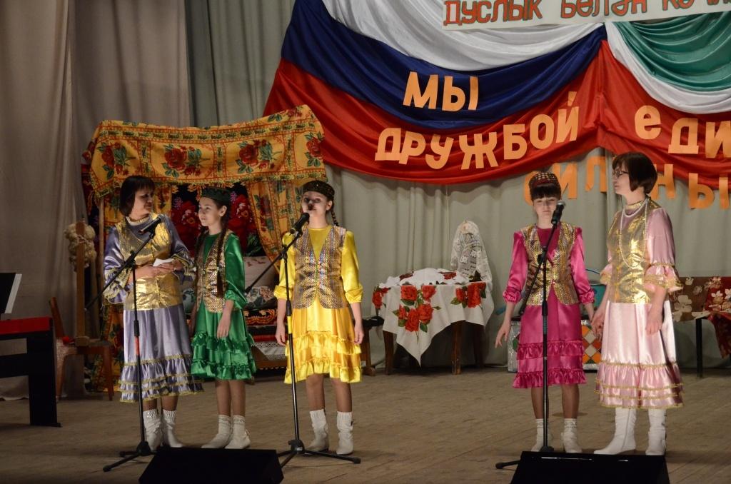 Еще одна маленькая изба в татарском стиле нашла свое воплощения в декорации на сцене. Тем временем в зале уже собрались зрители и концерт начался. Выступали как местные ансамбли «Бахетле Балалар», «Дуслык», «Яшлек, так и гости – ансамбль «Кугарсен» в своем большом номере показали детский обрядовый башкирский праздник «Корга Буткасы» (Воронья каша), а затем исполнили композицию, собранную из народных татарских песен. С песнями, стихами и танцами выступили и местные жители – Анна Новоселова, Фердинанд Камалов, Надежда Саляховна, Галима Каминская, Фаиль Яруллин, Фернат Аскаров.