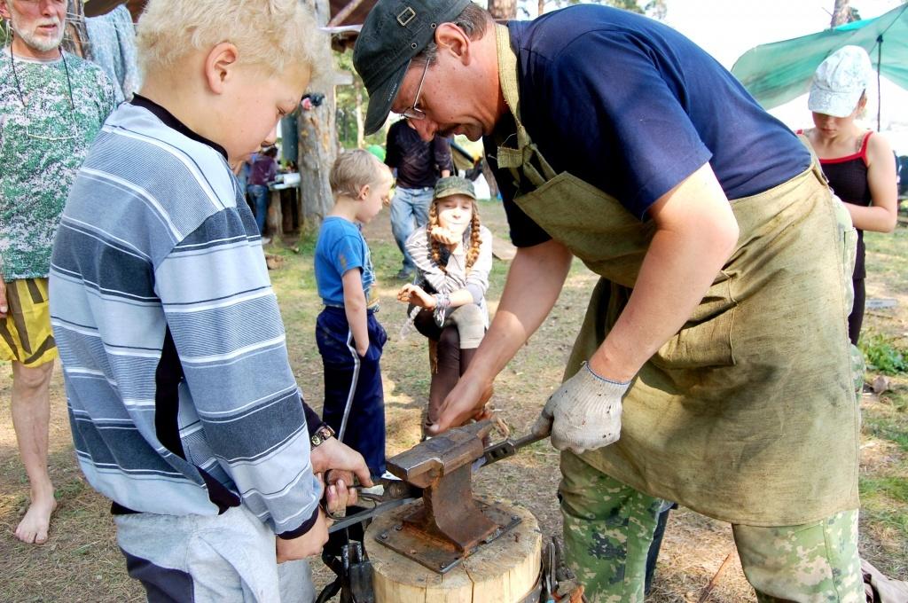 Вот, например, мобильная кузня, откуда звонко доносится стук молота. Ее хозяин Александр Петрович Быков – мастер производственного обучения екатеринбургского политехникума. Кузнечное дело и металлургия – его любимые увлечения. Жителей «Сыскара» он обучает плавить металл и ковать различные изделия – от оружия до ювелирных украшений. По иткульской технологии Александр Петрович отливает в тальковой форме ножи, а затем мальчишки их куют и точат, доводя до красоты. Девочки увлеченно плетут косички и замысловатые узлы из медной проволоки, создавая оригинальные браслеты и подвески для себя и в подарок. Для нужд лагеря ребята вместе с наставником сделали вертиль для запекания куры.