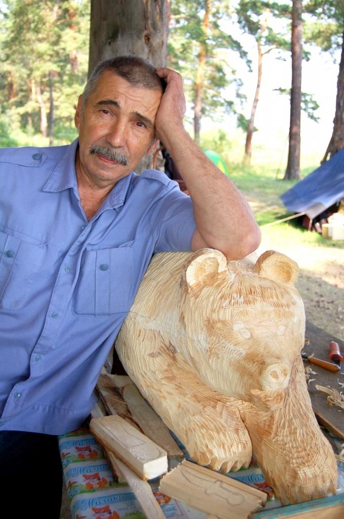 Еще один мастер, делившийся с детьми своим опытом, – Виктор Васильевич Трошков. В студии творчества в Екатеринбурге он преподает резьбу по дереву и изготавливает объемные фигуры на заказ. Одна из его последних работ – большой резной медведь – ярким примером стоит во главе стола, за которым с небольшими деревяшками устроились сыскаровцы. За час с небольшим при помощи инструментов им предстоит сделать своими руками ложку или другую фигурку на выбор.