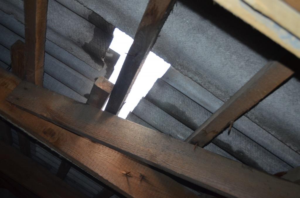 Жильцы самостоятельно залезали на крышу, чтобы задвинуть шифером дыру. Из-за нее и затопило квартиру. В прошлый четверг экскурсию провели и для меня. Здесь видны кусочки непонятного материала, которым латали крышу, множество мусора и старого шифера, который разбросан по чердаку. По всей крыше виднеются просветы – как раз те щели и дырки, через которые попадала вода. Где-то все еще было мокрым и покрытие на полу чердака.