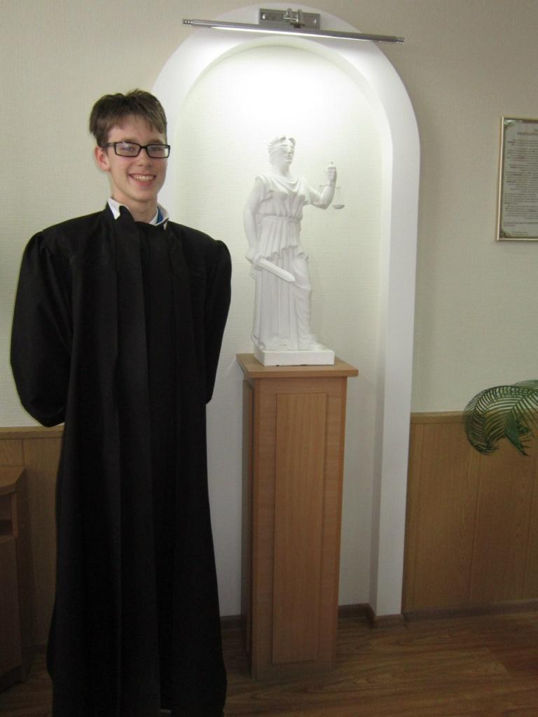 В одном из залов заседаний мы заняли места судей, защиты, обвинения, свидетелей и разыграли судебное заседание. Депутату из школы N35 п. В. Сысерть Антону Фролову даже посчастливилось примерить судейскую мантию. Александр Васильевич Трухин – интересный рассказчик, на наши вопросы отвечал различными примерами из жизни. В кабинете председателя мы рассмотрели большой альбом о бывших и настоящих сотрудниках суда. Этот кабинет украшает статуя богини правосудия Фемиды.