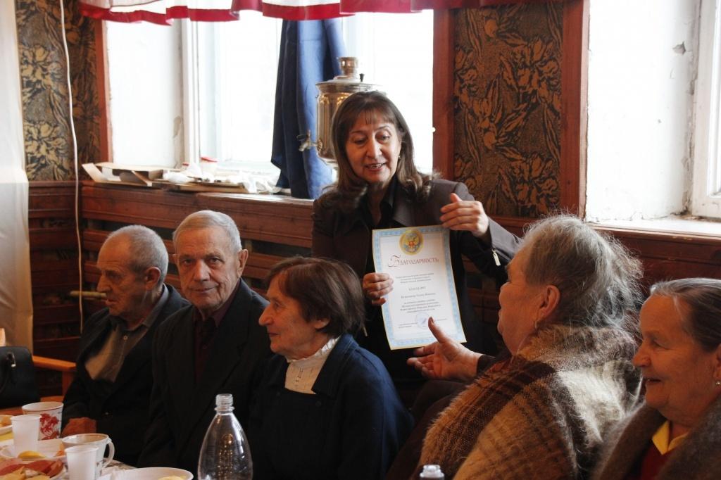 Привезти членов общества, которые, увы, не смогли бы прийти своим ходом, помогла глава Южной сельской администрации Л. А. Плотникова. Мы собрались в местном Доме культуры. Председатель отчитался о проделанной работе, поздравил нас с праздником и пожелал здоровья. Л. А. Плотникова вручила грамоту Ивану Ильичу и благодарственные письма активным членам общества. Перед гостями выступила директор дома культуры А. М. Чернохатова с поздравлениями и стихами. После официальной части выступил народный хор «Надежда».
