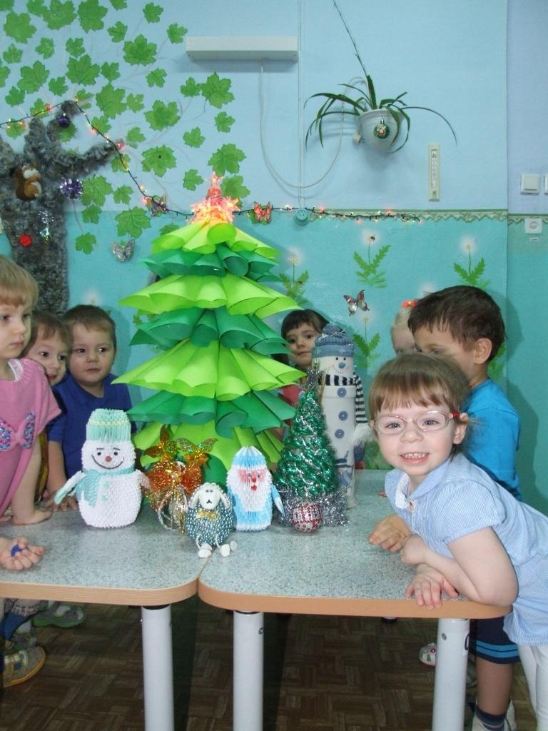 Родители вместе с малышами делали игрушки, придумывали названия, а воспитатель Татьяна Борисовна Горнова украсила группу и оформила выставку творческих работ. Здесь можно увидеть игрушки разных размеров и из разных материалов: Снеговик и Дед Мороз, выполненные в стиле оригами, шар, украшенный бусами, ёлочка из бумаги и много других интересных композиций.