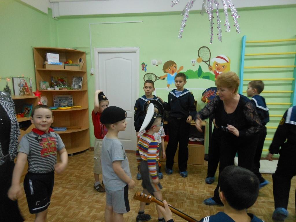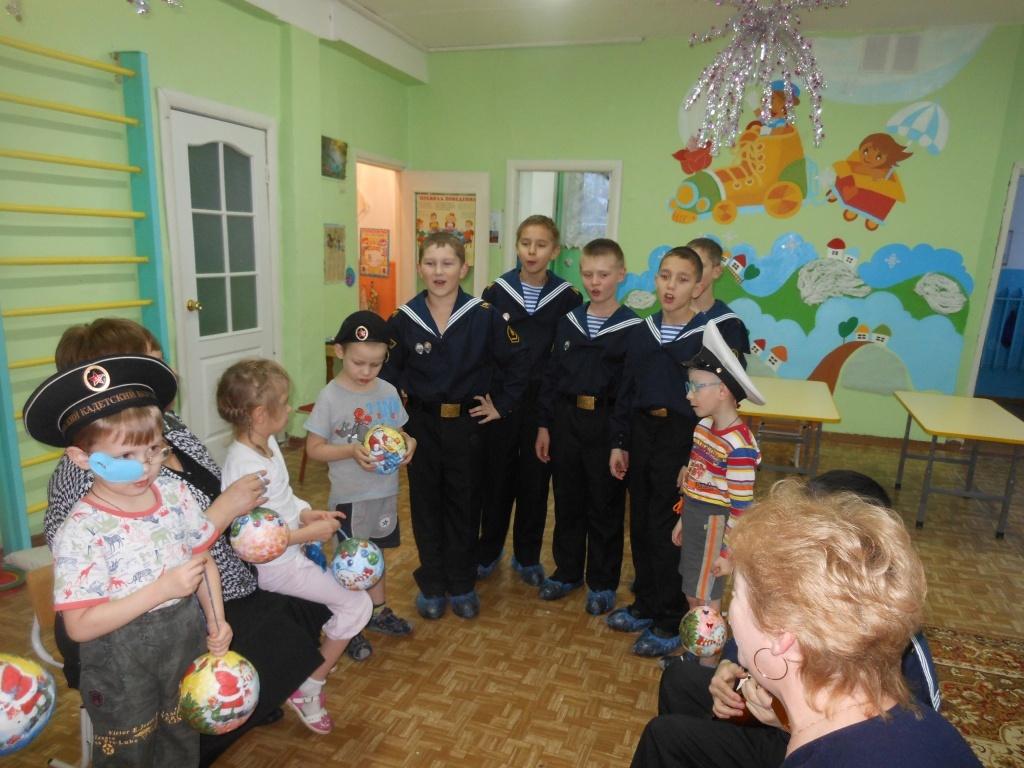 Замечательный сюрприз подготовили кадеты из 5 «В» дошколятам детского сада «Сказка». Со своим воспитателем Лидией Алексеевной Денисовой, они пришли к нам в группу и показали, на что способны будущие моряки: маршировали, пели, шутили и даже играли на балалайке.