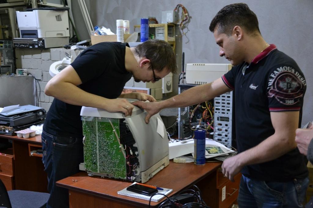 Самый «зеленый» здесь Василий Вяткин. Он учится на связиста, и еще до недавних пор молодой человек трудился монтажником в «Связьинформе». За месяц на новом месте он научился заправлять картриджи, разбирать и собирать принтер, без труда сможет установить операционную систему и программы на компьютере, заменить неисправные детали. Осваиваться Васе помогают более опытные ребята Евгений Резовский, который на днях как раз отметил годовщину со дня прихода сюда, и Егор Колясников, который чинит сложную технику уже четыре года.