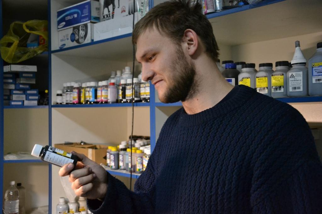 Львиную долю ежедневной работы составляет заправка картриджей для принтеров. Несколько стеллажей, уставленных цветными бутыльками с краской, и отдельное рабочее место предназначено исключительно для этой процедуры. А еще рядом можно заметить специальную установку, которая очищает картридж от остатков чернил – еще одно новшество мастерской.