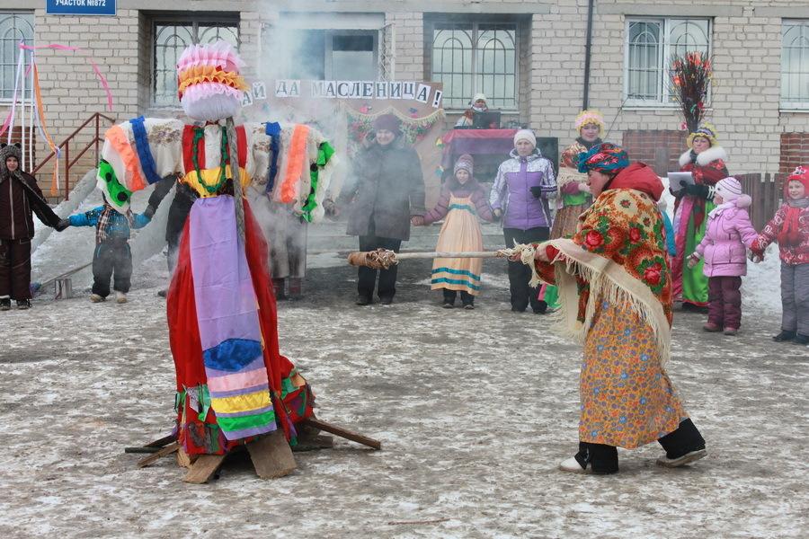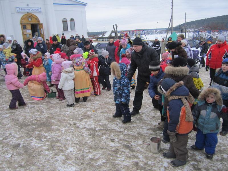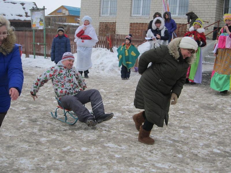 Зрители с радостью и весельем встретили свиту Масленицы – Зиму и Снеговика, – которые вывезли чучело Масленицы. Зима предложила поиграть в зимние игры. Ребятишки с удовольствием откликнулись. Взрослые от ребятни не отставали. Соревновались в беге в мешках, верхом на метле, вспомнили, как пекли раньше пироги в печи – носили блины на лопате. Тещи и зятья катали друг друга на санках.