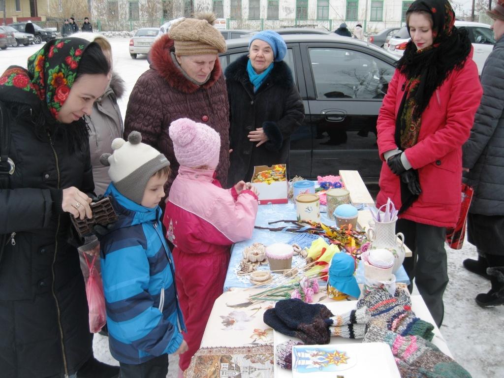 Для всех гостей городского празднества служба милосердия организовала выставку-ярмарку, где любой желающий мог взять поделку или понравившуюся ему вещь, угоститься блинчиками и пожертвовать деньги для трехлетнего Артема. Среди творческих работ можно было увидеть поделки, картины, украшения, цветы из бисера или конфет, вязаные носки и прочие милые и красивые вещицы.