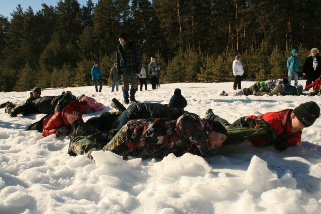 Нелегким конкурсом стал «вынос раненого из под обстрела», когда на армейских плащ-палатках ребята на скорость тащили своего «пациента» то ползком, то бегом по снежному полю.