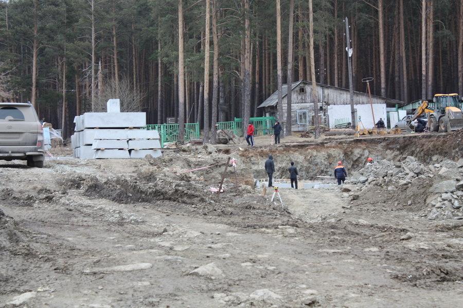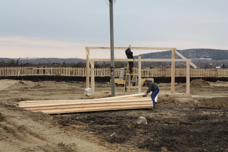 Здесь детский сад расположили на участке напротив спортивного комплекса и тоже неподалеку от соснового леса (бывшего парка). На строительном вагончике висит паспорт объекта. К слову, детские сады в Большом Истоке и в Сысерти строятся по одинаковому проекту – это будут трехэтажные здания, общей площадь околочетырех тысяч квадратных метров, а перед зданиями расположатся 11 прогулочных площадок для детей. В отличие от Сысерти, никаких внешних признаков хотя бы фундамента не обнаружили. Строители занимались созданием временного деревянного объекта, а трактор – разравнивал поверхность площадки.