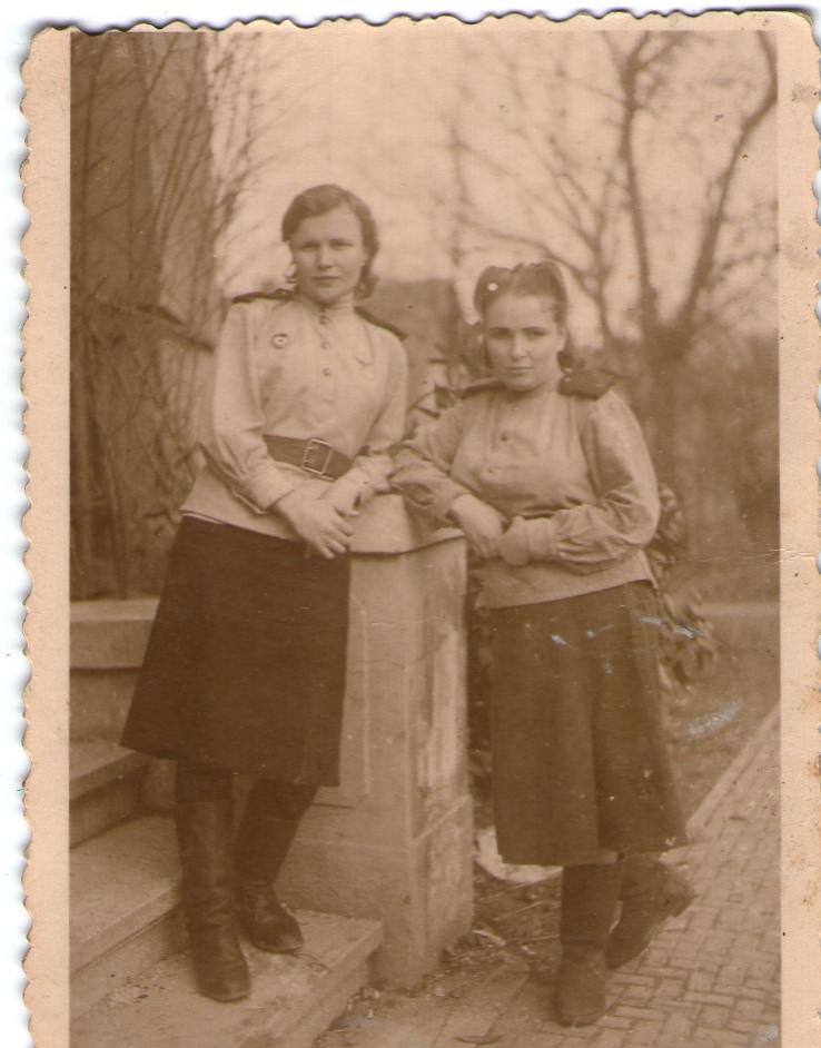 Мамы моей уже нет. Но остались фотографии, я их берегу и храню, как частицу нашей общей истории. Может быть, кто-то узнает на этом студенческом фото себя или своих родных, знакомых. Моя мама в первом ряду, в чёрном платье с белыми пуговицами. А на другом фото – её подруги Надя и Лида (март 1945 г.)