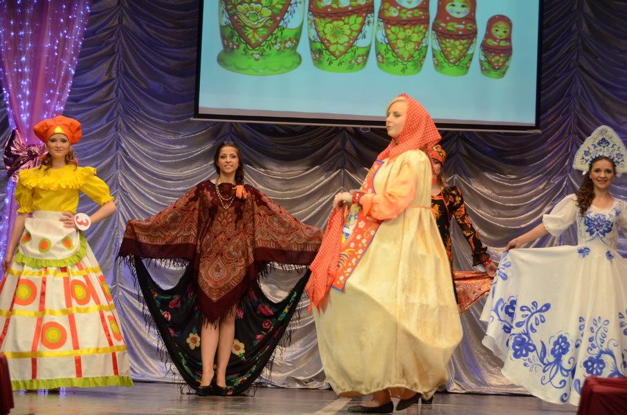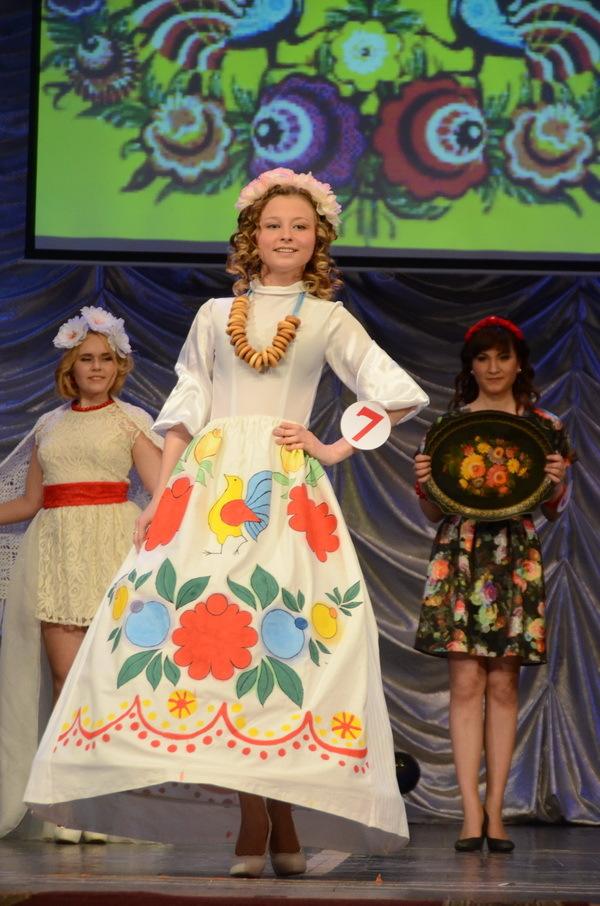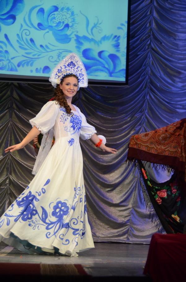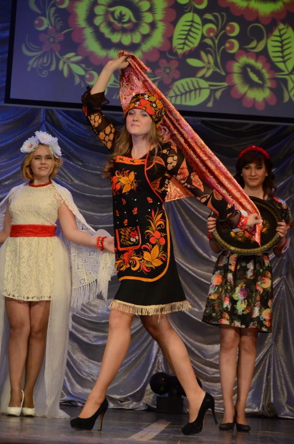 Следующий этап – дефиле «Достояние России». Тут уж грех было не проявить фантазию. Конкурсантки представил в костюмах, посвященным самым красивым и значимым народным ремеслам – гжельская роспись, дымковская игрушка, русские платки, матрешка и многое другое.