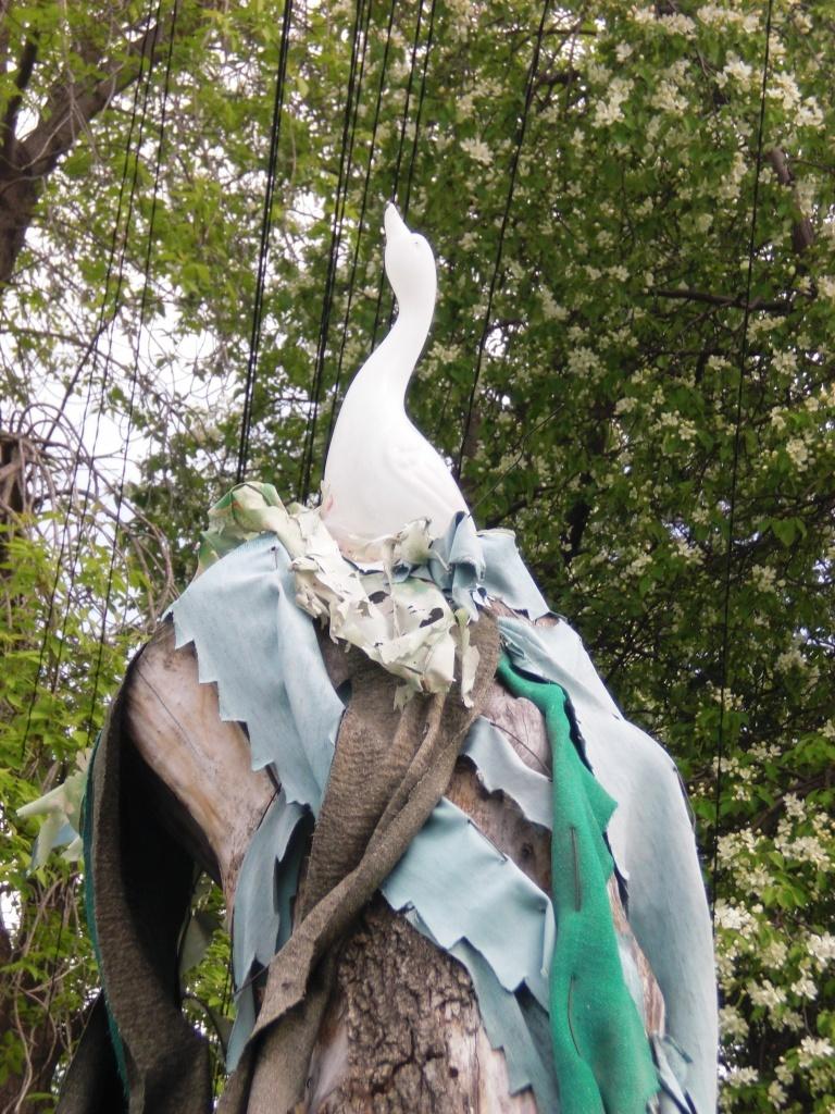У ветеринарной станции в глаза бросилась фигура белого лебедя. Ее усадили на обрубок тополя, который остался после спиливания веток. Гнездо игрушечной птице свили из остатков материи.