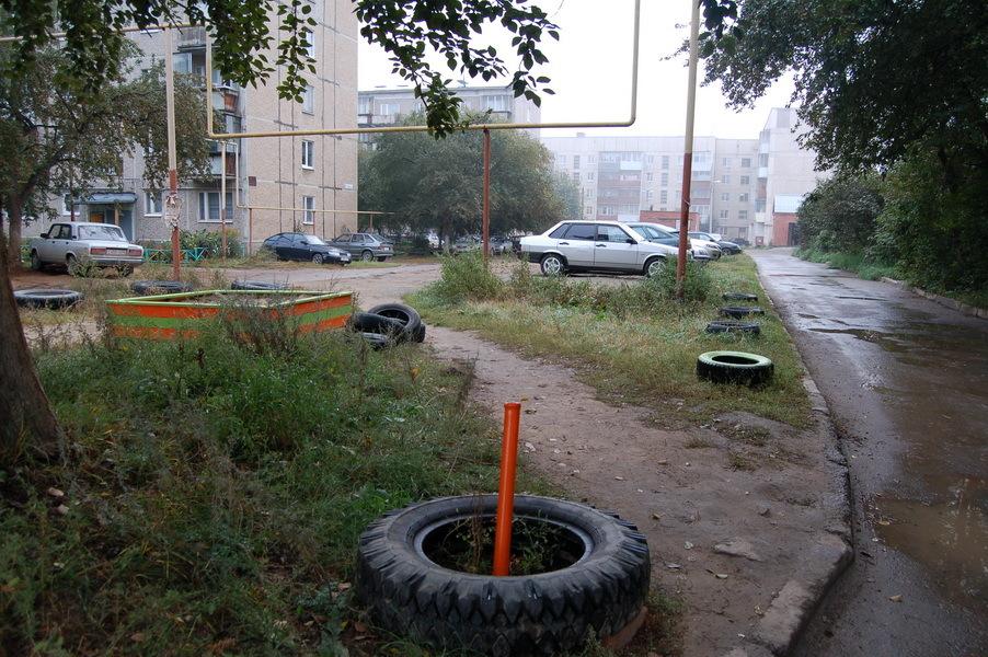 Траву во дворе живущие здесь бабушки скосили сами. Чтобы хоть чуть-чуть загородиться от машин, можно установить старые автомобильные колеса, о красивых изгородях и не мечтаем, но нам и это не под силу.