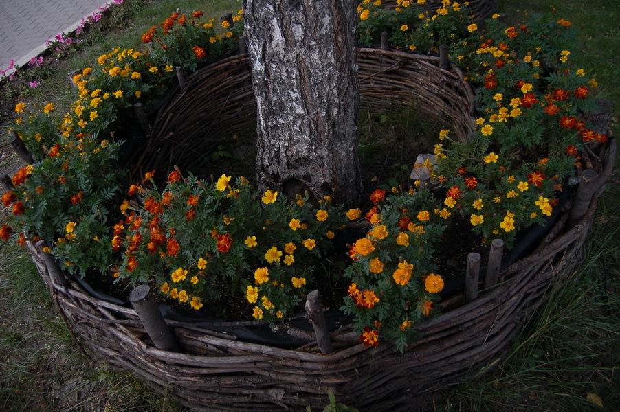 Выход есть. Можно сделать небольшие и красивые грядки или клумбы – это зависит от вашего желания – прямо вокруг деревьев. Место в приствольных кругах пустует (надеюсь, что все садоводы знают, что под яблонями картофель не садят – эти культуры не сочетаются), нужно его с пользой использовать. Отступаем от ствола одинаковое расстояние по всему периметру круга (корневую шейку дерева засыпать нельзя), вбиваем колышки. Их высота может быть любой, но, думаю, больше 30 см поднимать грядку над уровнем почвы нет смысла. Сантиметров через 25-30 (а может и больше, это зависит от вас) один круг, снова вбиваем колья. Берем лозу (ивы в окрестностях растет много) и оплетаем сначала внутренний круг, затем – внешний. Получилась основа для грядки. Но землю засыпать в нее еще рано. Сначала закрываем внутренние поверхности стенок самым плотным черным укрывным материалом, он и лишнюю влагу выпустит, и земле не даст высыпаться сквозь щели плетения, и позволит почве в нашей грядке дышать. После этого можно заполнить грядку землей.
