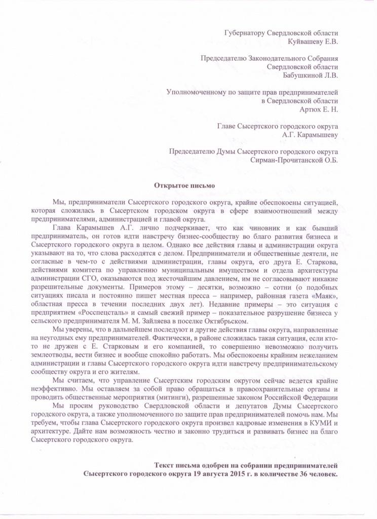 Губернатору Свердловской области Е. В. Куйвашеву, председателю законодательного собрания Свердловской области Л. В. Бабушкиной, Уполномоченному по защите прав предпринимателей в Свердловской области Е. Н. Артюх, главе сысертского городского округа А. Г. Карамышеву, председателю думы СГО О. Б. Сирман-Прочитанской.