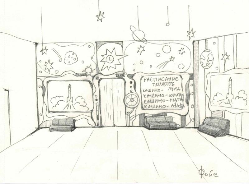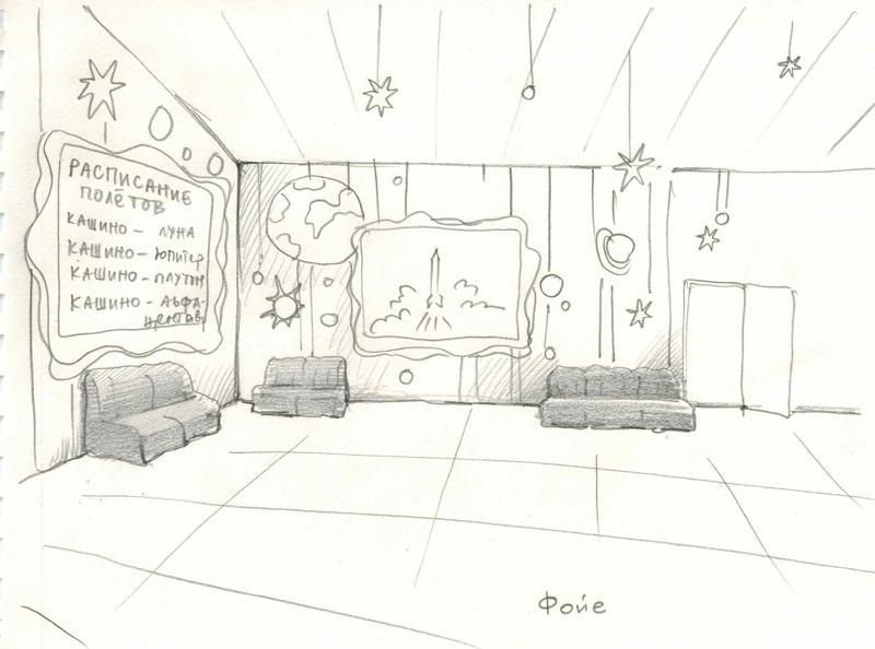 Фойе дома культуры: Через шлюзовую камеру-накопитель гости попадают в фойе. Фойе стилизовано под современный сказочный космопорт. У 3-4 стоек регистрации работники космопорта регистрируют инопланетных пассажиров с багажом и гостей из Екатеринбурга. На медиа-экранах документальная трансляция взлетов ракет с космодромов в Плесецке, на Байконуре и Куру. Работает межгалактический буфет с космическими напитками. Через стойки регистрации гости, получив космические лазерные фонарики, попадают в пассажирский отсек космического корабля. Перед креслами – Экран управления полетом.