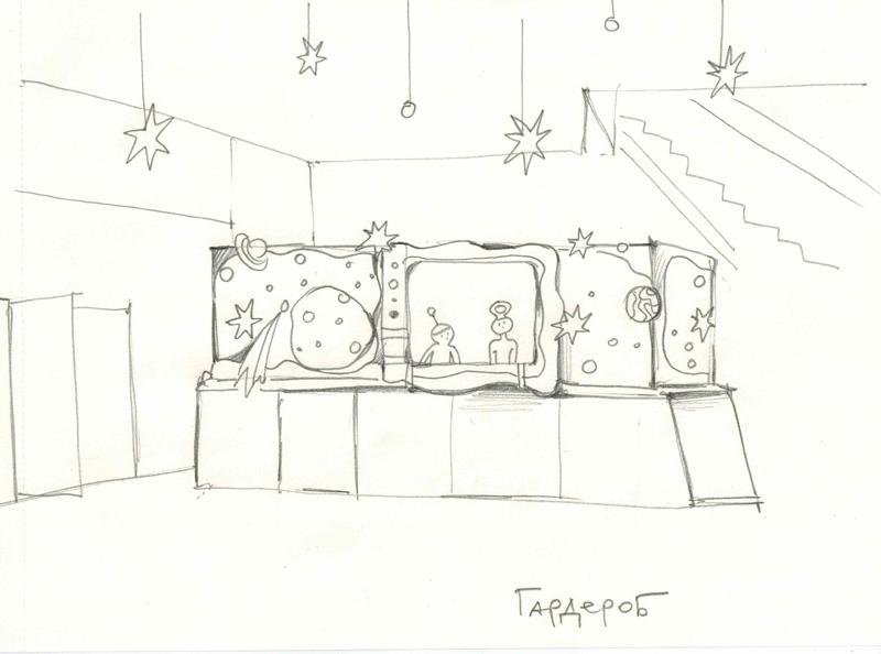 Гардероб: В космическом гардеробе работник космопорта и помощник-инопланетянин принимают верхнюю одежду гостей, перед входом в фойе – шлюзовая камера-накопитель; в сопровождении дежурного оператора шлюзовой камеры и помощника-инопланетянина гости предъявляют космические билеты-бейджики и входят группами в переходный шлюз.
