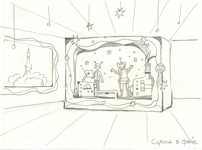 Место действия: Кашино, входная группа дома культуры. Гостей встречают скульптуры в космическо-фантастическом духе. Стилизованные двери-шлюз открывают два «инопланетянина», дети и взрослые – работники кашинского космопорта.