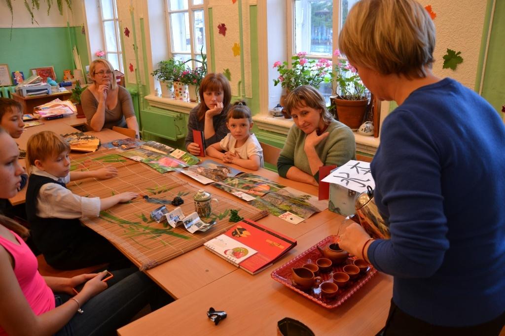 Затем дети познакомились с гостьей из Екатеринбурга А. В. Драничниковой, которая часто бывает в командировках в Китае. Она показала и рассказала о том, как пьют чай в этой стране, какое значение придают жители востока этой церемонии. С собой она привезла глиняный чайный сервиз, такой, из каких пьют чай в простых китайских семьях. Как истинные ценители древней традиции, участники встречи словно обдумывали каждое свое движение, будучи за столом, смаковали, делали небольшие глоточки, создавая особую атмосферу.