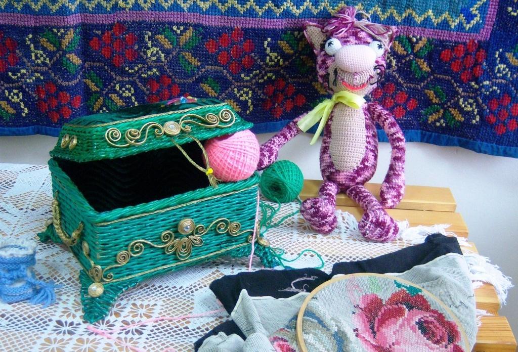 Выставка сложилась из трех экспозиций. На одной представлены старинные изделия из домашних коллекций 19-20 веков – тканые, вышитые, кружевные, вязаные. На второй можно увидеть современные изделия, которые выполнены сотрудниками и студентами. А третья – самая необычная зона – здесь вы найдете старинные прялки, машины для шитья и ручного вязания.
