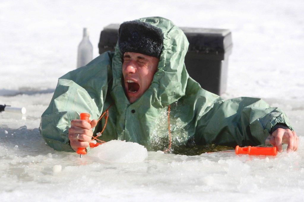 Стараясь не обламывать кромку, без резких движений нужно выбраться на лед, наползая грудью и поочередно вытаскивая ноги на лед. Если лед выдержал, нужно откатиться в сторону, а затем ползти туда откуда пришли (поверхность здесь уже проверена на прочность).
