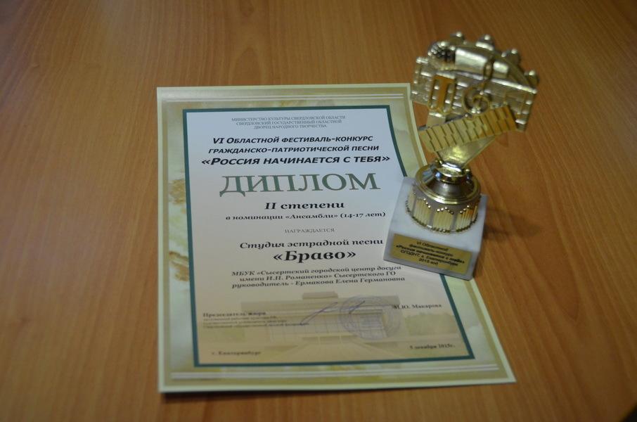Очень высоко оценило жюри выступление студии эстрадной песни «Браво» (руководитель Е. Г. Ермакова) Сысертского городского центра досуга имени И. П. Романенко. Коллективу были вручены Кубок и Диплом дипломанта II степени. Что особенно приятно: члены жюри высказали в адрес «Браво» много лестных слов. Услышать такое от профессионалов – дорогого стоит.