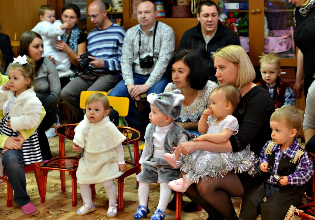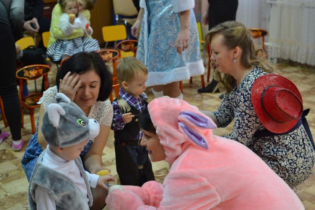 Малыши от года до двух с половиной веселились, играли с Лунтиком , Дедом Морозом и Снегурочкой. Родители не меньше детишек радовались встрече со сказочными героями, водили хоровод возле елочки и любовались своими снежинками, зайчатами, ковбоями. В конце праздника дети получили яркие подарки и еще долго не хотели уходить из сказочного и пока незнакомого королевства.